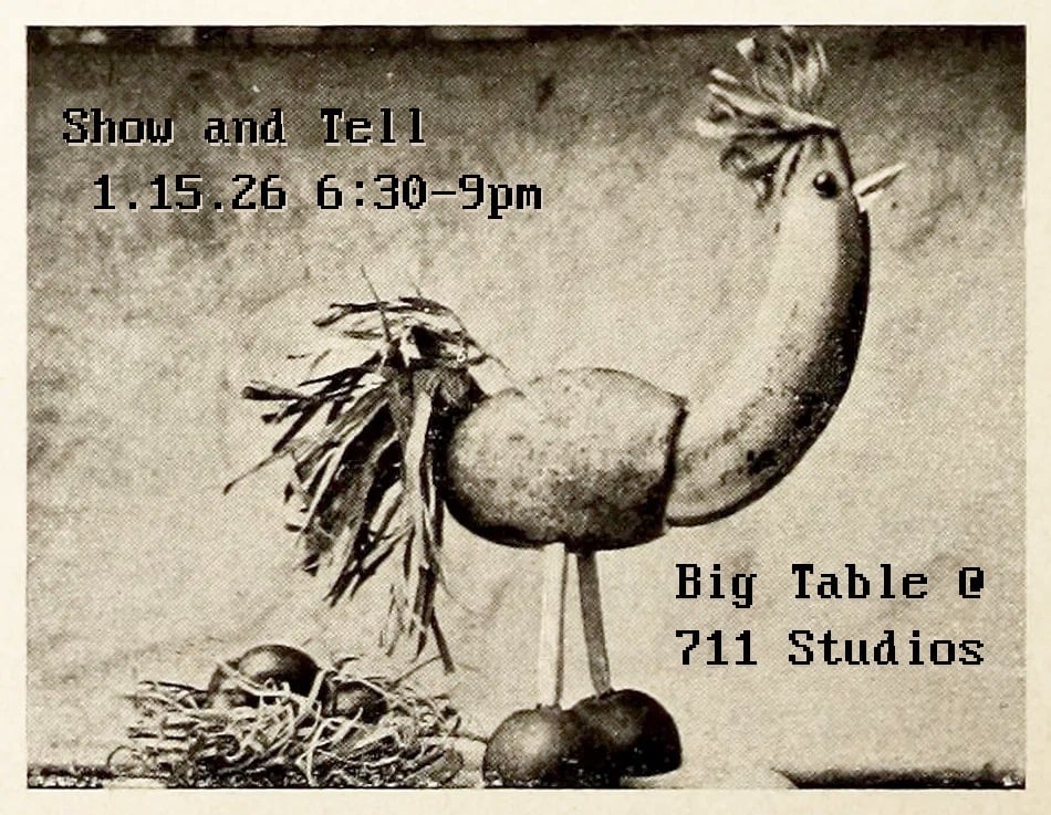 We’ll meet at the Big Table in the kitchen of 711 Studios and can use my studio down the hall if we need to. NA beverages will be provided. Friends are very welcome.